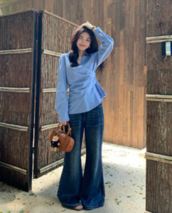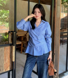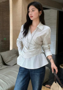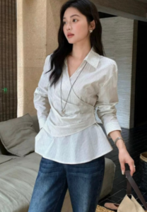 📍側邊系帶收腰交叉條紋襯衫