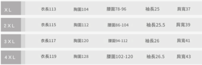 XL(適合65-75KG) ,2XL(適合75-85KG) ,3XL(適合85-95KG) ,4XL(適合95-120KG) |