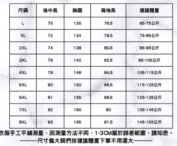 L(適合65-75KG) ,XL(適合75-85KG) ,2XL(適合85-95KG) ,3XL(適合95-105KG) ,4XL(適合105-115KG) ,5XL(適合115-125KG) ,6XL(適合125-135KG) ,7XL(適合135-145KG) ,8XL(適合145-155KG) |