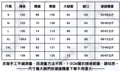 S(適合50-55KG) ,M(適合55-60KG) ,L(適合60-67KG) ,XL(適合68-72KG) ,2XL(適合73-80KG) ,3XL(適合90-87KG) |