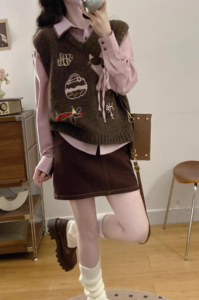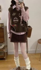 學院風針織馬甲高腰短裙三件套