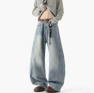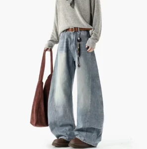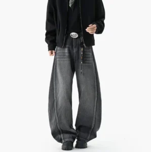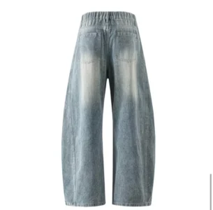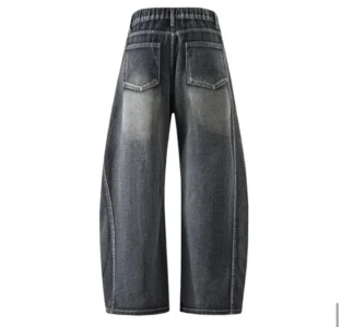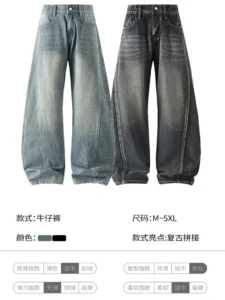 復古水洗拼接彎刀牛仔褲