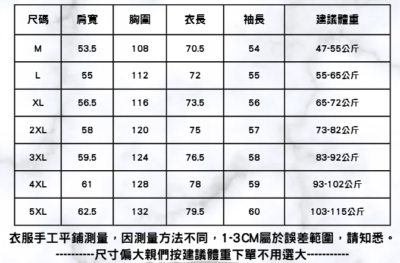 M(適合47-55KG) ,L(適合55-65KG) ,XL(適合65-72KG) ,2XL(適合73-82KG) ,3XL(適合83-92KG) ,4XL(適合93-102KG) ,5XL(適合103-115KG) |