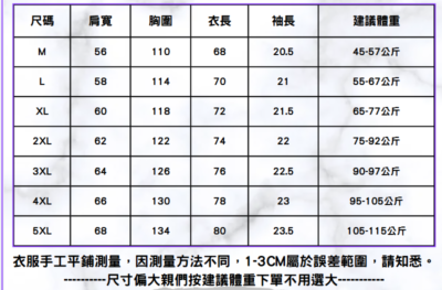 M(適合45-57KG) ,L(適合55-67KG) ,2XL(適合75-92KG) ,3XL(適合90-97KG) ,4XL(適合95-105KG) ,5XL(適合105-115KG) ,XL(適合65-77KG) |