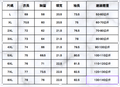 L(適合50-60KG) ,XL(適合60-70KG) ,2XL(適合70-80KG) ,3XL(適合80-90KG) ,4XL(適合90-100KG) ,5XL(適合100-110KG) ,6XL(適合110-120KG) ,7XL(適合120-130KG) ,8XL(適合130-140KG) |