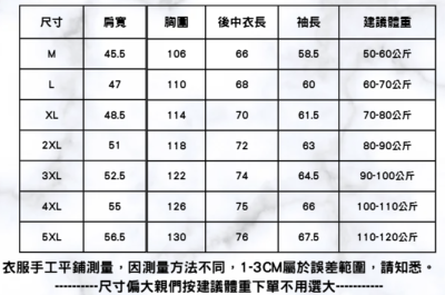M(適合50-60KG) ,L(適合60-70KG) ,XL(適合70-80KG) ,2XL(適合80-90KG) ,3XL(適合90-100KG) ,4XL(適合100-110KG) ,5XL(適合110-120KG) |